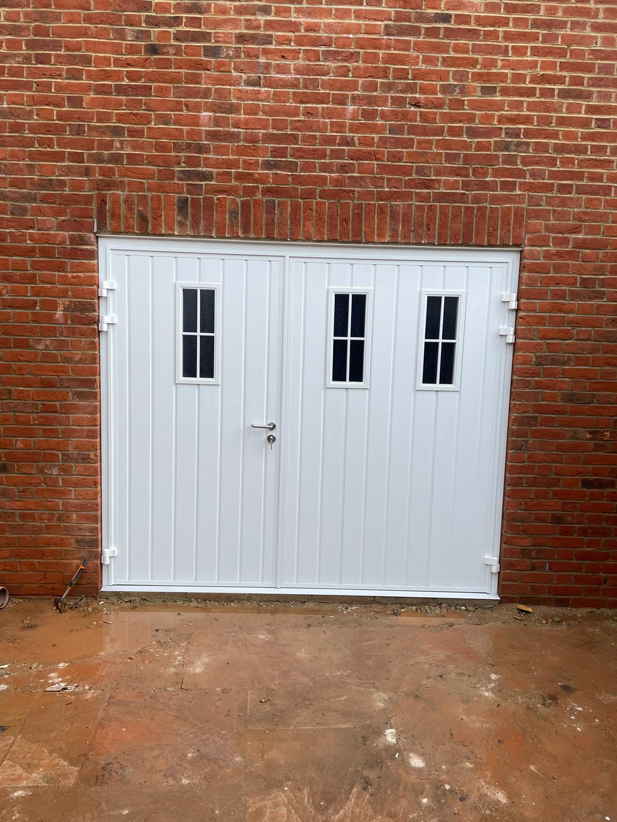Side-hinged garage doors open outwards on hinges, like a pair of large cupboard doors.
